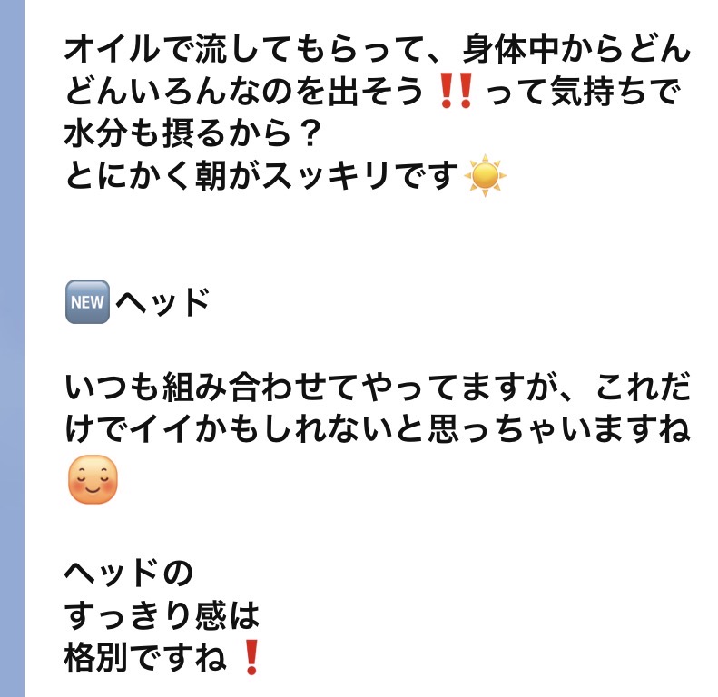 60分で肩回りや首もしっかりアプローチするので、“これだけでイイかも!”のお言葉です。