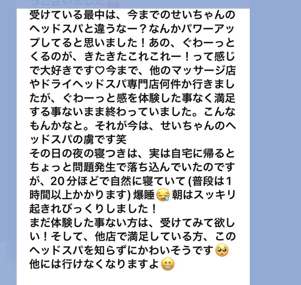 私のヘッドスパを大絶賛してくださるお客様🍎都内などたくさんのヘッドスパ店に行くも、いわゆる”ハズレ”が多く私のヘッドスパで初めて満足できたとのこと。これを知らないなんてかわいそうまでいただきました笑