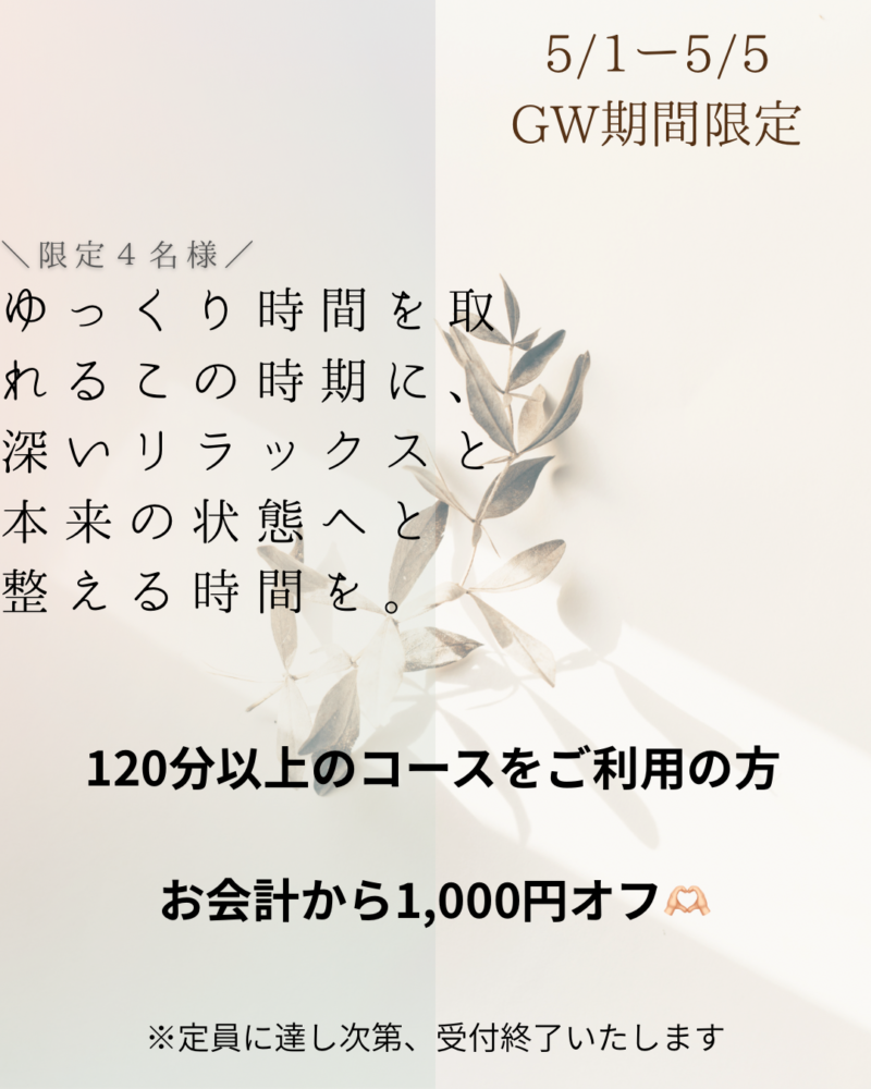 連休でゆっくり時間を取れる方、ぜひこの期間に不調に向き合い本来の自分へとリセットする時間を作りませんか🫶🏻ささやかながら 120分以上ご利用の方は、リーズナブルぬ受けていただけます🧘♀️ 組み合わせも、単品も可能。ペア割ではなく、この1000円🈹を適応です!