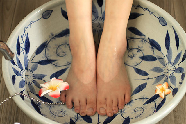 はじめに足湯で足をきれいに洗い、温めて血行をよくしてから施術に入ります。足湯はサービスです。